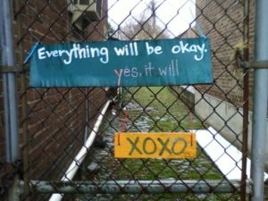A while back I found myself walking the streets in my neighborhood after having a particularly difficult day – and just by chance I happened to look up and notice this sign hanging on the fence in front of an alleyway. This simple message, “Everything will be ok. yes, it will” left by some anonymous person, was enough turn everything around. It may sound silly to think that an anonymous message could help that much – but really I think that it did. I caught the image on my cellphone and referred back to it periodically, and in this very subtle way, it was a reminder that I was not alone. Someone else had felt the same way. The message sat with me and it began to crank open the door that I had slowly been nailing shut. It gave me hope and a sense of connection. It helped give me the energy to take action, to reach out to others, to face what I needed to face. And then eventually, things got better.